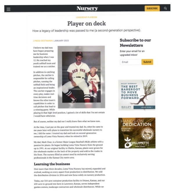EAGL Kappa Lyndsi Oestmann (Loma Vista Nursery) shares her perspective on being the “Player on Deck” in a family business with great insights on how to both BE the player on deck – and how to position the company well for the ‘next player up’. (Originally published in Nursery Management Magazine, Jan 2023)